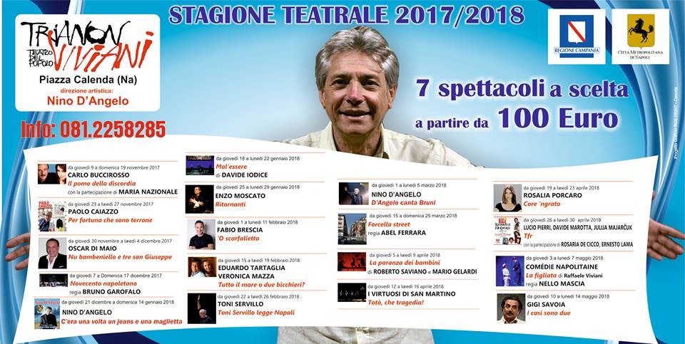 Nino D’Angelo, direttore artistico del Teatro Trianon (piazza Vincenzo Calenda 9 – Napoli), è lieto di presentare il cartellone per la stagione teatrale 2017/2018 e sulla sua pagina Facebook scrive: “Abbonatevi e fate abbonare”. Di seguito le date: