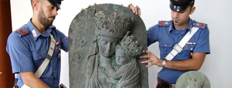 Erano stati abbandonati sulla riva di un piccolo corso d’acqua in via Piombiera, a Torre Annunziata . E’ qui che i carabinieri della locale stazione li hanno ritrovati: si tratta di due bassorilievi in bronzo raffiguranti la Madonna con in braccio il bambino. Il primo piu’ grande (70×100 cm), l’altro di dimensioni piu’ ridotte (40×45). Quando uno dei due fu portato via da sconosciuti nella zona a ridosso del rione Rovigliano posta tra la parrocchia di San Michele Arcangelo e la struttura religiosa del Villaggio del Fanciullo, nel luglio del 2015, ci fu la rivolta di un intero quartiere: ”Chi sa faccia qualcosa per consentirci di ritrovare le opere prima della festa del 5 agosto”. Da allora sono invece trascorsi piu’ di due anni, con indagini serrate che hanno preceduto il ritrovamento odierno. Le due opere raffiguranti la Madonna della Neve con in braccio il bambino, entrambe della parrocchia di San Michele Arcangelo, sono state restituite al parroco della chiesa. Non e’ escluso che si possa pensare di organizzare una festa per celebrare l’importante ritrovamento. Proseguono le indagini per stabilire l’identita’ degli autori dei furti e chi abbia sistemato quelle due opere a ridosso del piccolo corso d’acqua dove poi sono state ritrovate.