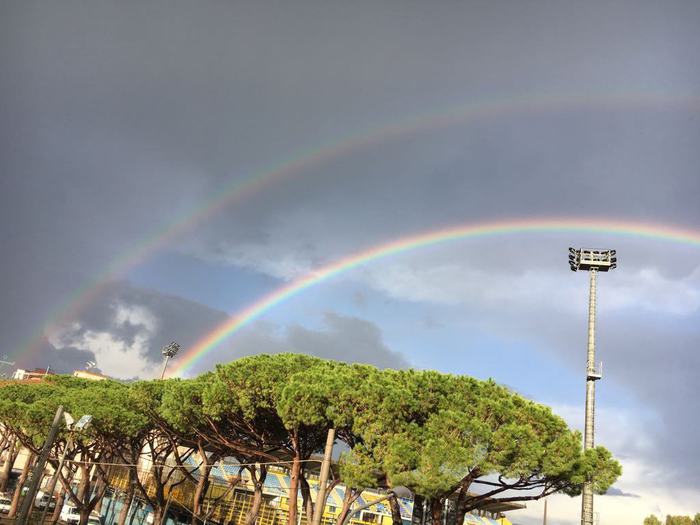 E’ diventato virale sul web la foto con il doppio arcobaleno a Castellammare con lo sfondo dello stadio Romeo Menti. Dopo gli acquazzoni e gli allagamenti di ieri e oggi c’è chi spera in qualcosa di buono grazie al doppio arcobaleno. Lo sperano i tifosi della Juve Stabia, ma anche la squadra, che nel tardo pomeriggio è impegnata nella gara del campionato di serie C contro il Francavilla