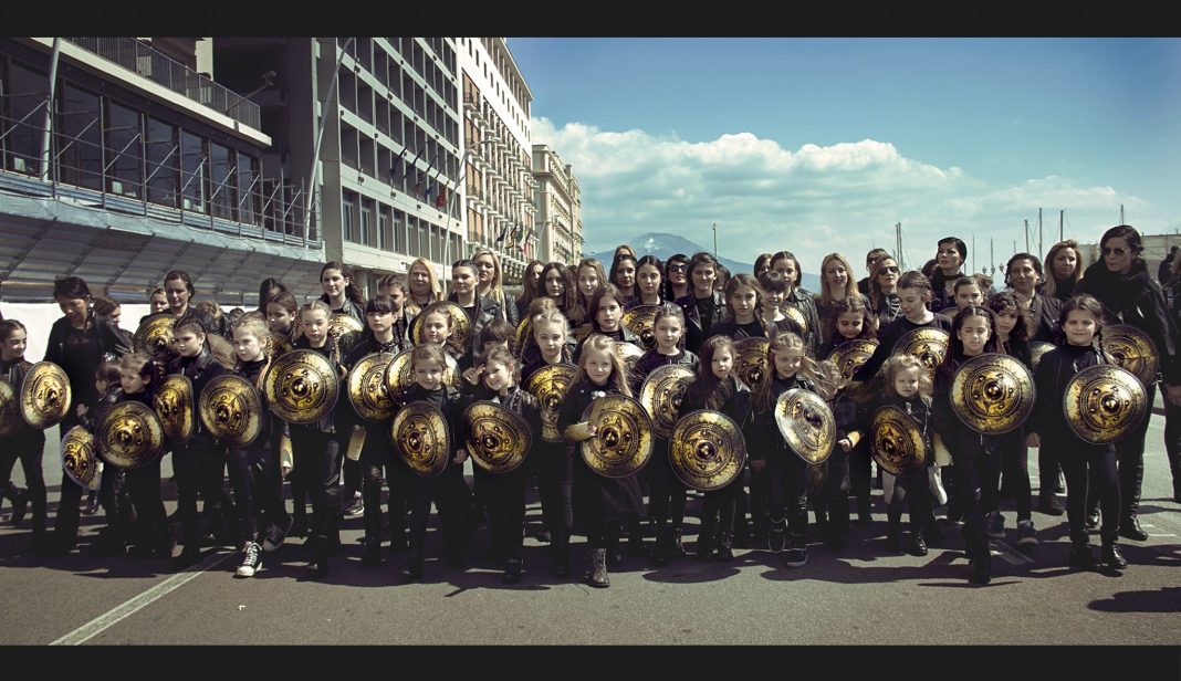 Mamme e bambine, vestite di nero con scudi e bracciali da guerriere, due segni dorati sul volto e una treccina, si sono ritrovate sul Lungomare di Napoli per “Amazons 5.0”, la artmob performance organizzata da ViGroup International Social Art Association, presieduta da Viviana Falace.