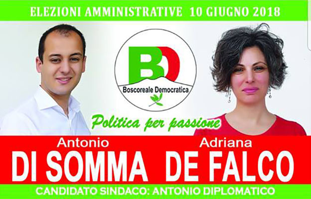 Boscoreale. E’ aperta ufficialmente la campagna elettorale per le elezioni amministrative di Boscoreale. Sono sei i candidati sindaci che ambiscono a succedere al primo cittadino uscente Giuseppe Balzano. Fa il pieno con nove liste Antonio Diplomatico (Boscoreale nel cuore-Lista Langella; Forza Boscoreale; Movimento Bosco-Reale; Patto per la mia città; Boscoreale Democratica; Lista Civica Con te in Comune; Respiro boschese; Movimento popolare Campano; Progetto per Boscoreale) che ha convogliato intorno al suo progetto politico liste civiche di ispirazione del Pd e del Centro. A contendere la fascia di sindaco a Diplomatico ci saranno: Pasquale Di Lauro con tre liste e poi con una lista ciascuno, Nicola Sergianni (Fratelli d’Italia), Carmine Sodano (Lega), Mario Trerè (Lista Civica) e Alfonso Langella (Lista civica). Domani 13 maggio alle 19,30 i candidati della lista Boscoreale Democratica, di ispirazione del Pd, Adriana De Falco e Antonio Somma – ex assessore comunale -, inaugureranno il comitato elettorale in via Trivio Marchesa. Il simbolo di Boscoreale Democratica era già presente alle scorse amministrative quando sostenne il sindaco uscente Giuseppe Balzano. E’ stata una delle prime liste ad essere presentata stamane dalla coalizione del candidato sindaco Antonio Diplomatico. Ecco tutti i nomi della lista capeggiata dal duo Antonio Di Somma e Adriana De Falco: