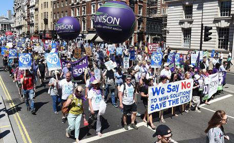 Decine di migliaia di persone hanno manifestato per le strade di Londra per celebrare il 70esimo anniversario del servizio sanitario nazionale (NHS, National Health System) e chiedere la fine dei tagli del governo al servizio sanitario, che negli ultimi anni ha subito privatizzazioni di vaste aree. Lo riferisce il Guardian online. Con in mano cartelli con la scritta ‘I tagli lasciano cicatrici’, ‘Per le persone che non hanno profitti’ e ‘Democrazia o potere corporativo’, i manifestanti si sono poi fermati davanti a Downing Street per chiedere le dimissioni del premier, Theresa May, Poco dopo il leader dell’opposizione laburista, Jeremy Corbyn, si è rivolto al corteo – secondo gli organizzatori c’erano almeno 40mila partecipanti – chiedendo la fine delle privatizzazioni, la chiusura del mercato interno affinché il personale non sia più subappaltato a società private e che l’assistenza sociale sia adeguatamente finanziata.
