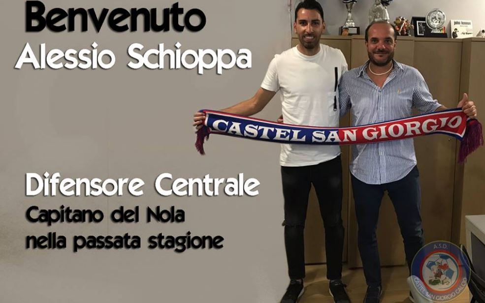 Inizia il calciomercato in entrata anche in casa Castel San Giorgio. I rossoblu si sono assicurati le prestazioni sportive dell’esperto difensore Alessio Schioppa, reduce dalla buona stagione con la maglia del Nola, con cui è arrivato in finale Play Off e ha raggiunto la finale di Coppa Italia Dilettanti regionale. Classe ’83, Schioppa ha giocato inoltre con San Tommaso, Arzachena, Pomigliano, Irsinese, Ebolitana, Sapri, Pianura, Potenza e Terzigno.