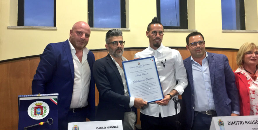 Il capitano del Napoli, Marek Hamsik da oggi e’ cittadino onorario di Castel Volturno, comune del Casertano dove la societa’ azzurra ha insediato il suo quartier generale e dove lo slovacco vive da anni. Il sindaco della citta’, Dimitri Russo, lo ha insignito della cittadinanza onoraria nel corso di una cerimonia che si e’ tenuta nel pomeriggio, alla presenza di circa un migliaio di persone. Poco prima, il Consiglio comunale ha deliberato all’unanimita’ la decisione di conferire il riconoscimento allo slovacco. Alla cerimonia pubblica ha preso parte anche un gruppo di tifosi locali della Juventus, che ha consegnato una targa al capitano del Napoli. “E’ stata una bellissima iniziativa – ha commentato il sindaco Russo – Marek e’ un grande calciatore e un cittadino esemplare”. Nel corso del suo intervento, il capitano del Napoli ha definito Castel Volturno la sua “seconda casa”.