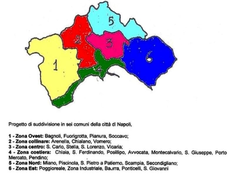 “ Il progetto, da me elaborato – precisa Capodanno -, prevede un comune Napoli Ovest, corrispondente al territorio degli attuali quartieri di Bagnoli, Fuorigrotta, Pianura e Soccavo; mentre i quartieri Arenella, Chiaiano e Vomero costituirebbero il Comune Collinare ed i quartieri S. Carlo all’Arena, Stella, S. Lorenzo e Vicaria, il Comune Napoli Centro. I quartieri Chiaia, S. Ferdinando, Posillipo, Avvocata, Montecalvario, S. Giuseppe, Porto, Mercato e Pendino confluirebbero nel Comune Costiero, il Comune Nord riguarderebbe i territori dei quartieri Miano, Piscinola, Marianella, S. Pietro a Patierno, Scampia e Secondigliano ed infine il Comune Est si estenderebbe sui attuali territori di Poggioreale, Zona industriale, Barra, Ponticelli e S. Giovanni a Teduccio “.