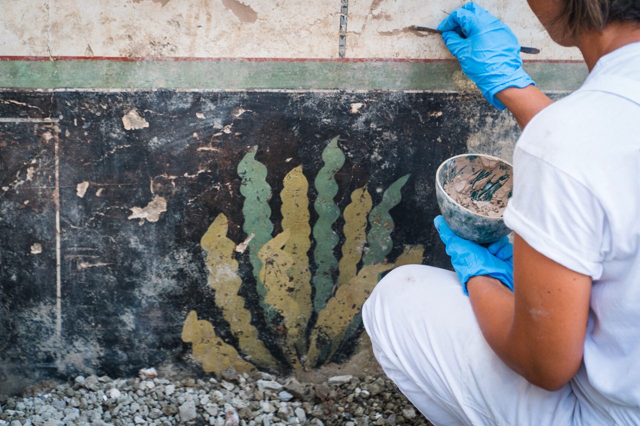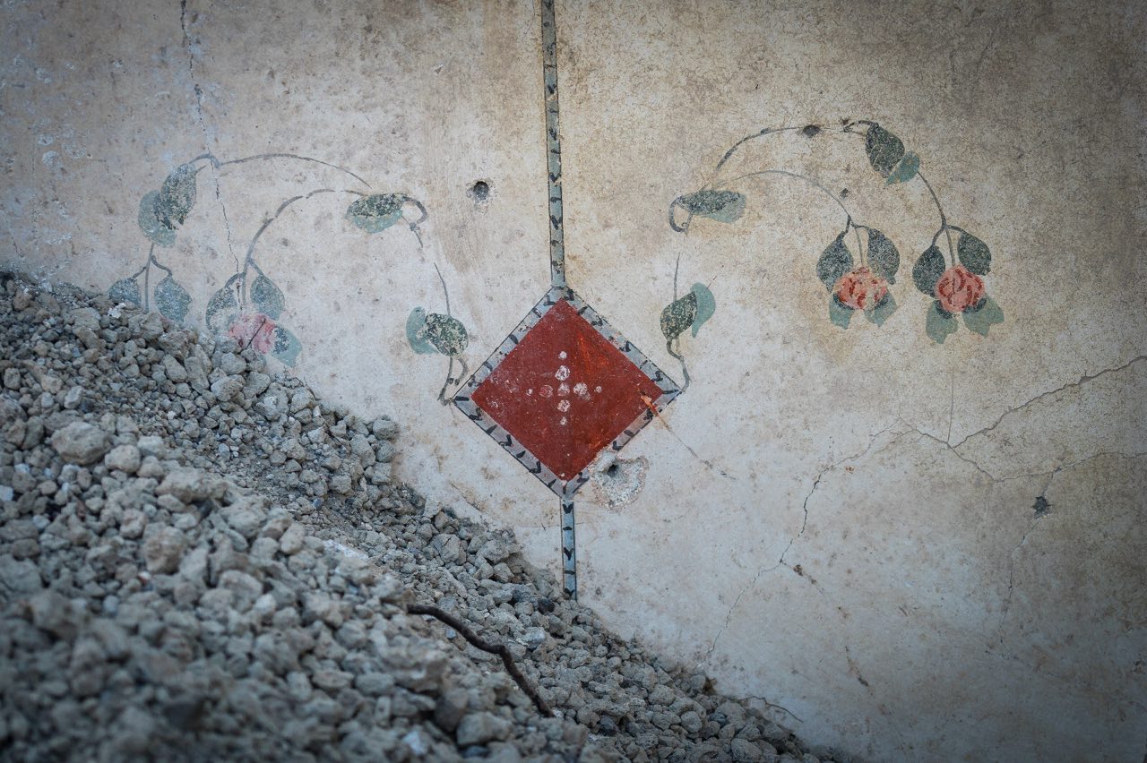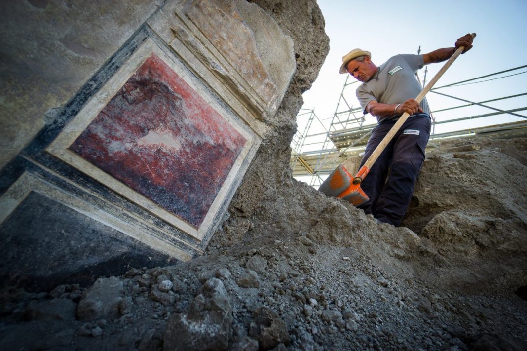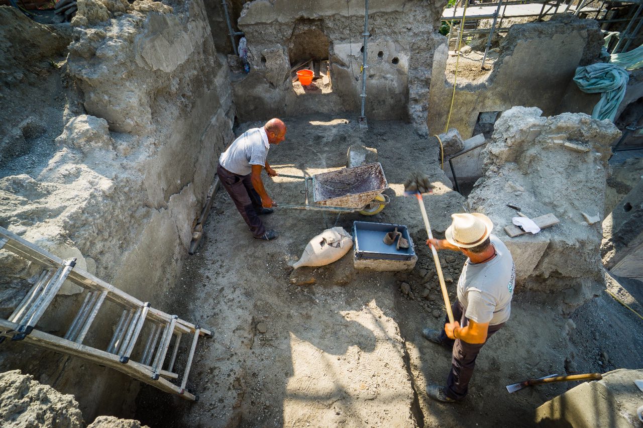Pompei. Ancora sorprese dai cantieri della Regio V di Pompei, dove sono in corso scavi legati ai lavori per la messa in sicurezza idrogeologica dell’area. Domus che continuano a delinearsi nella loro struttura completa, con affreschi preziosi, oggetti e tracce di vita quotidiana. Una di queste ricche dimore e’ quella di Giove, che sta emergendo con tutti i suoi ambienti decorati. La residenza e’ gia’ stata in parte scavata tra Settecento e Ottocento e piuttosto compromessa in piu’ punti da cunicoli e trincee, tuttora visibili, con i quali in epoca borbonica si esplorare la citta’ antica romana dalla quale si portavano via opere. Il nome della casa deriva da un quadretto raffigurante Giove rinvenuto gia’ nell’800 su un larario posto nel giardino. L’intervento odierno sta via via profilando la pianta di una dimora con atrio centrale, circondato da stanze decorate, ingresso lungo il vicolo dei balconi, anche esso di recente scoperta e sul fondo uno spazio aperto colonnato su cui si affacciano altri tre ambienti. Gli ambienti di rappresentanza attorno all’atrio hanno una ricca decorazione in primo stile, con riquadri di stucco che imitano lastre (crustae) marmoree dipinte di vivaci colori (rosso, nero, giallo, verde), e, conservata in alcuni punti della parte superiore, una ricca cornice di stucco con modanature dentellate.