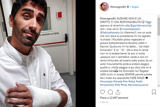 Nel post su Instagram, Magnini scrive: “Oggi speravo di divertirmi, ma un auto che non dava la precedenza mi ha tagliato la strada!Risultato polso ingessato e grossa botta/ematoma diciamo sotto il bacino!