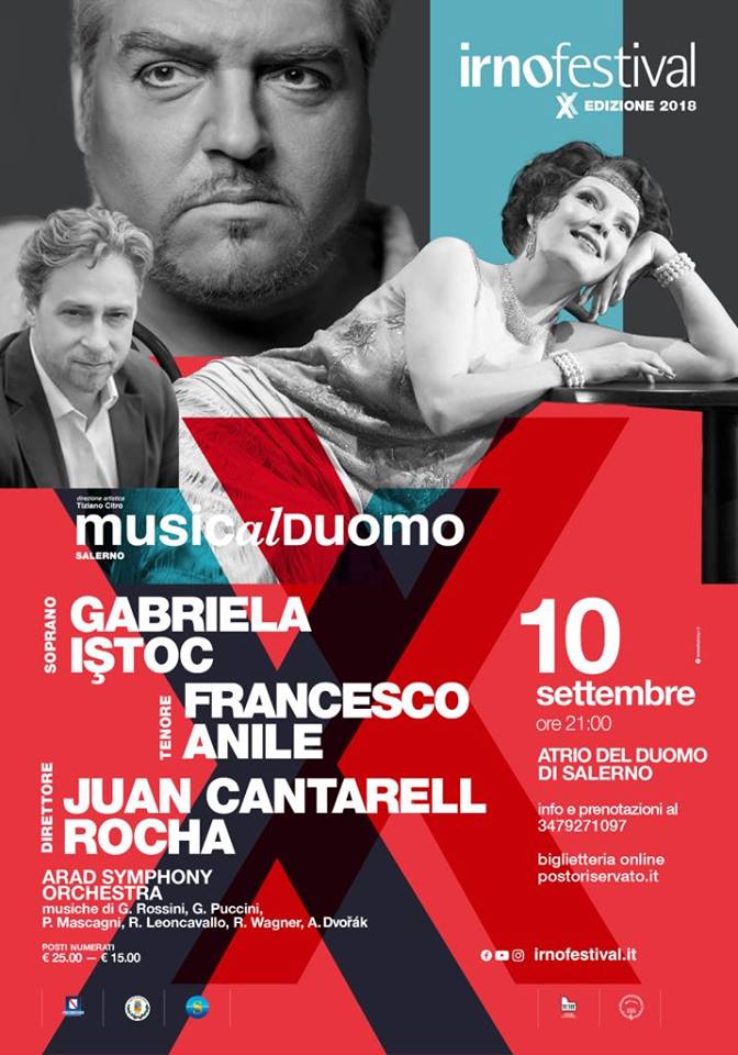 Si chiude lunedì 10 settembre, alle ore 21.00, il quarto e ultimo appuntamento con le voci del tenore Francesco Anile e del soprano Gabriela Istoc, raffinati cantanti lirici di caratura internazionale che si esibiranno sul palco allestito nell’atrio del Duomo di Salerno. Saranno accompagnati dalla Arad Symphony Orchestra diretta da Juan Cantarell Rocha.