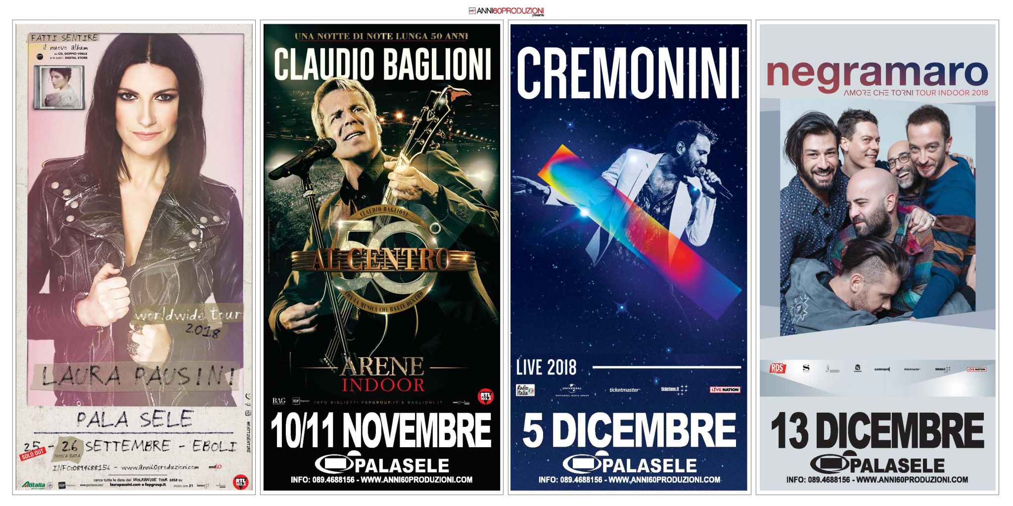 Laura Pausini e il “Fatti sentire – Worldwide tour 2018” attesa il 25 e il 26 settembre (la prima tappa è già sold out, per la seconda gli ultimi biglietti ancora disponibili in prevendita) riaccende i riflettori sul PalaSele. Doppio appuntamento anche con Claudio Baglioni, in scena il 10 novembre e 11 novembre con “Al centro tour”. Partita già anche la corsa al biglietto per il campione del pop d’autore Cesare Cremonini attesissimo il 5 dicembre con il suo “Cremonini Live 2018”. Saranno poi i Negramaro a chiudere l’eccezionale 2018 al PalaSele di Eboli: la nuova tournée della band “Amore che torni tour indoor 2018”, farà tappa al PalaSele di Eboli il 13 dicembre. Ricco di sorprese e appuntamenti, con il top della musica pop, si prospetta anche il calendario 2019 al PalaSele: già annunciato il primo show per il 18 febbraio con la seconda parte di “Essere qui tour” di Emma. Per tutti gli spettacoli l’inizio è previsto per le ore 21.00 e le prevendite sono già attive. Per informazioni 089 4688156 – www.anni60produzioni.com