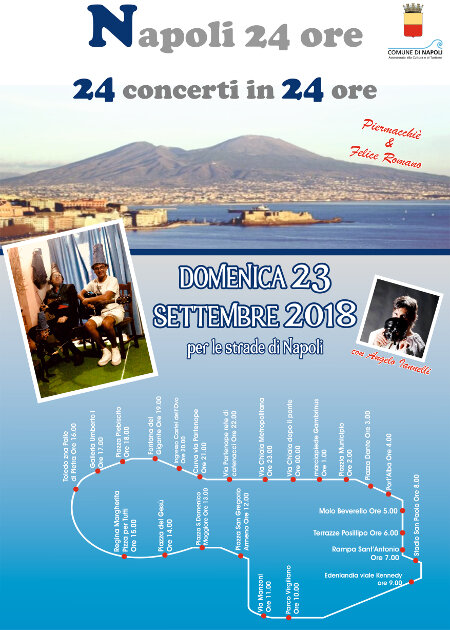 Napoli, città d’arte, cultura e musica, riafferma una delle sue più antiche vocazioni con ventiquattro concerti in ventiquattro ore in ventiquattro luoghi della città. L’idea è venuta a due artisti napoletani, Pier  Macchié e Felice Romano ed è una sorta di percorso metropolitano dove faranno vivere la musica classica napoletana con ventiquattro concerti in ventiquattro ore, ognuno dei quali avrà la durata di ventiquattro minuti e vedrà protagoniste ventiquattro canzoni classiche napoletane opportunamente miscelate. Introdotti da Pulcinella (Ospite speciale), interpretato dall’attore Angelo Jannelli, gli artisti si sposteranno in ventiquattro posti diversi e simbolici di Napoli: monumenti, panorami, edifici storici e anche posti particolari per “scattare 24 fotografie” della vita di Napoli. La scelta della musica napoletana non è casuale e non tanto perché sono musicisti ma anche per ribadire che Napol è una città musicale, dove la musica suona dagli elementi naturali (mare, vento) a quelli vocali (pescatori, mercati, clacson) fino a quelli dei veri musicisti.