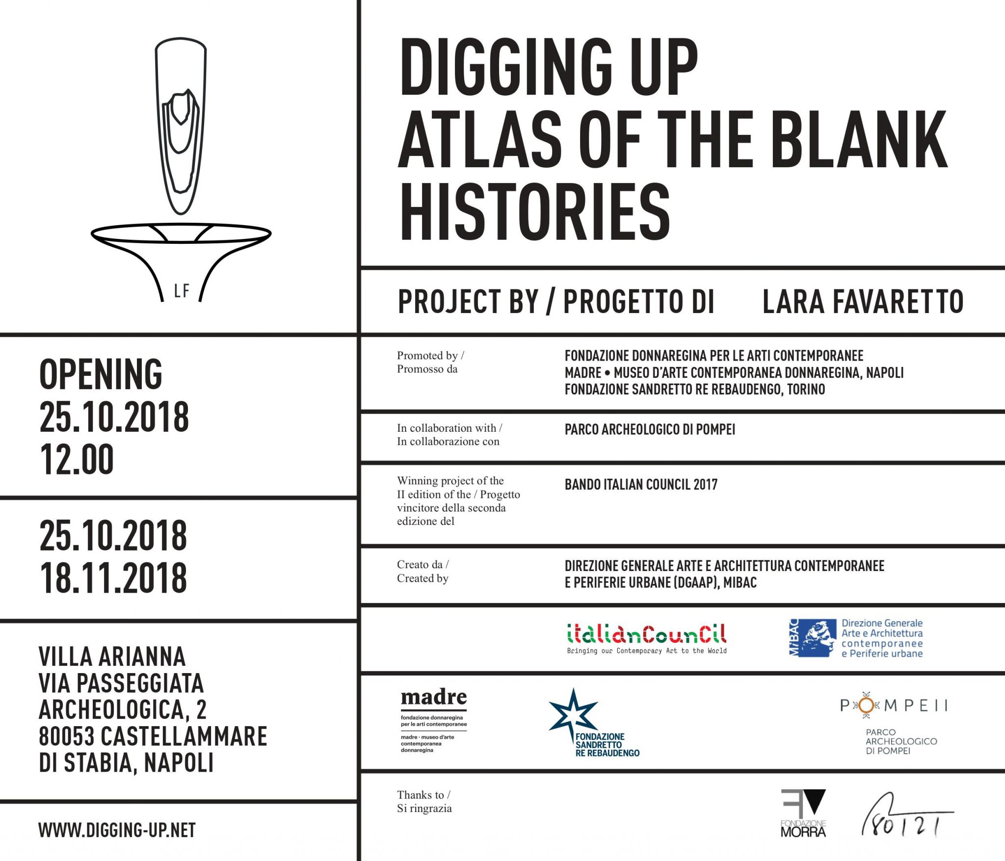 Giovedì 25 ottobre, alle ore 12.00, presso Villa Arianna a Castellammare di Stabia, la Fondazione Donnaregina per le arti contemporanee/Madre, museo d’arte contemporanea della Regione Campania e la Fondazione Sandretto Re Rebaudengo di Torino, in qualità di promotori, in collaborazione con il Parco archeologico di Pompei, hanno il piacere di presentare alla Stampa il progetto di Lara Favaretto DIGGING UP. ATLAS OF THE BLANK HISTORIES/Indagare il sottosuolo. Atlante delle storie omesse, vincitore della seconda edizione del Bando Italian Council 2017, ideato dalla Direzione Generale Arte e Architettura Contemporanee e Periferie Urbane (DGAAP) del Ministero per i beni e le attività culturali.