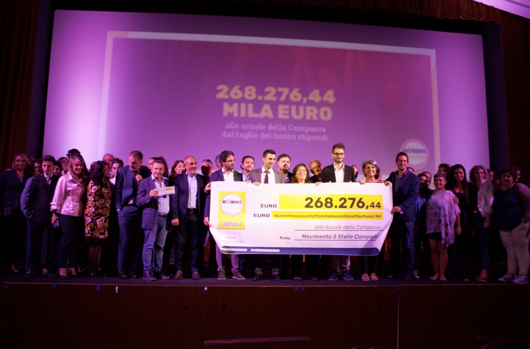 “Oggi – hanno dichiarato sul palco i consiglieri del gruppo regionale M5S – è uno di quei giorni in cui siamo particolarmente fieri di essere portavoce nelle istituzioni Uno di quei giorni in cui diventiamo l’emblema concreto di quanto la politica può fare bene al paese e ai cittadini se rinuncia ai suoi privilegi e li investe in bene comune e opportunità di crescita, restituendoli alla collettività. In tre anni e mezzo in Campania abbiamo restituito 570mila euro, 37 i milioni complessivamente restituiti a livello nazionale da parlamentari e consiglieri regionali, che diventano 90 se consideriamo la rinuncia ai cosiddetti rimborsi elettorali. Immaginiamo cosa si potrebbe fare se questa rinuncia volontaria divenisse legge in questo paese. Ed è questo uno dei principali obiettivi per cui continuiamo a batterci”.
