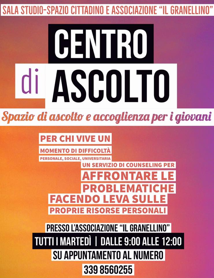 L’iniziativa nasce dalla preziosa collaborazione tra la “Sala Studio – Spazio Cittadino” e l’Associazione “Il Granellino”, una realtà storica della nostra città. Il Centro si propone come spazio di ascolto per chi vive un momento di difficoltà personale, relazionale, universitaria. Presso il Centro sarà presente un counselor che aiuterà i giovani ad affrontare le proprie problematiche, facendo leva sulle risorse personali di ciascuno.L’iniziativa, totalmente gratuita per gli utenti, recepisce le esigenze manifestate dai giovani del territorio che trovano nella Sala Studio un luogo di aggregazione e confronto, prima ancora che di studio.Il Centro è una realtà unica nel vesuviano. Crediamo fortemente che i disagi giovanili, sovente destinatari di scarso interesse, meritino di essere trattati con la doverosa attenzione. Troppo spesso sottovalutati, finiscono sotto i riflettori della cronaca, quando sfociano in eventi eclatanti o drammatici.Lo sportello sarà attivo tutti i martedì mattina, dalle 9.00 alle 12.00, su appuntamento telefonico al numero 3398560255, presso l’Associazione “Il Granellino”, in P.zza Muncipio 9, San Sebastiano al Vesuvio (NA).