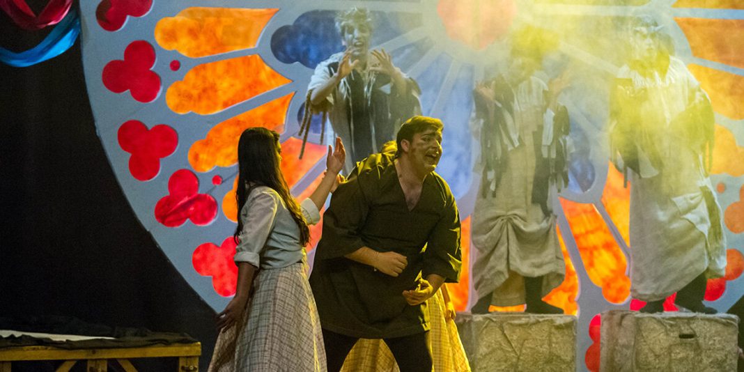 “Perchè un uomo odia, perché un mostro ama” … Grande quesito che si perde nella notte dei tempi e a cui ancora non si è riusciti a dare una risposta. Questo il sottile fil rouge che unisce tutti i personaggi della messa in scena: il loro modo di reagire all’essere reietti, abbandonati, dimenticati. Soli ma armati della forza e della volontà di reagire e affrontare le avversità della vita, pronti a guardare sorgere il sole di un nuovo giorno sulle guglie svettanti di Notre Dame che dall’alto guarda e tace. Cuore dello spettacolo è infatti proprio la maestosa cattedrale – che già Hugo, nel romanzo, indicava come un essere vivente dotato di una propria coscienza – rifulgente di luce, di colori e di speranza (come nella canzone di Esmeralda). Il risultato è una storia dipinta con una tavolozza di colori schiariti e sgombra dalle ombre gotiche che aleggiano invece nel romanzo. Quasimodo è fin da subito sensibile, assetato di contatto umano e ben disposto verso il prossimo, desideroso di dare, di ricevere e con lo spirito rivolto alla speranza. Una commovente favola capace di emozionare grandi e piccini raccontando un “miracolo” d’amore: quello che nasce dall’unione di ciò che solo apparentemente era inconciliabile, lontano per forma, lingua, provenienza sociale. Perché per quanto possa essere diverso il colore della nostra pelle, sarà sempre lo stesso unico sole a scaldarcela.