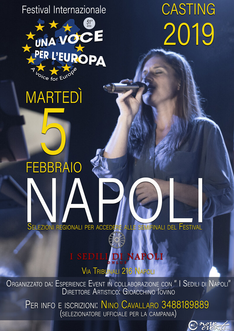 Martedì 5 febbraio dalle ore 16 alle 20 presso I Sedili di Napoli onlus, in via dei Tribunali 216, si terranno i casting regionali della Campania di questo prestigioso Festival canoro Internazionale, giunto al suo cinquantunesimo anno di vita. Il concorso, rivolto acantanti singoli, duo e band, vuole lanciare nuovi talenti nel panorama musicale italiano. Al termine delle selezioni 2019, che coinvolgeranno giovani da tutta Italia, Una Voce per l’Europa si concluderà con una finalissima il 31 agosto a Chianciano Terme, in provincia di Siena. Il vincitore del Festival si esibirà anche il giorno successivo, 1 settembre 2019, nell’ambito di un programma televisivo (Sky) e gli verrà dedicato un servizio giornalistico su canali televisivi Mediaset. A uno o più finalisti potrà essere offerta la realizzazione di un videoclip professionale, con pubblicazione sul canale musicale Vevo, e/o un contratto fonografico oppure la promozione del brano in gara via radio/tv/web-tv. La partecipazione al casting di martedì 5 febbraio a Napoli è gratuita. Per prenotarsi è necessario contattare al 348 8189889 Nino Cavallaro (responsabile regionale del Festival). L’evento è organizzato da Esperience Event in collaborazione con “I Sedili di Napoli”; il direttore artistico è Gioacchino Iovino. Chi il 5 febbraio convincerà la giuria, potrà accedere direttamente alle semifinali del Festival. La serata di casting di Una Voce per l’Europa a Napoli è aperta al pubblico e ad ingresso libero.