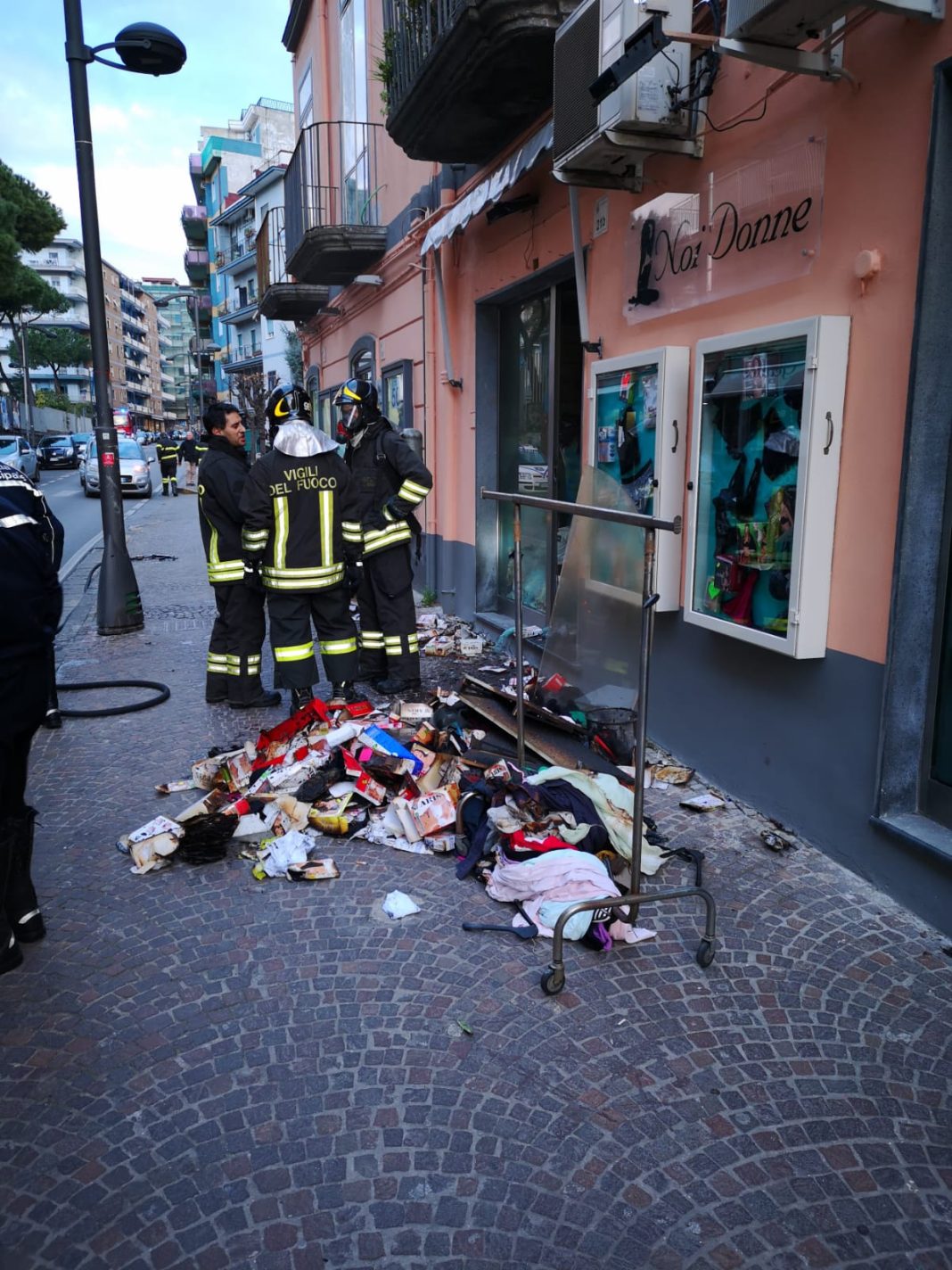 San Giorgio a Cremano. In via De Lauzieres intorno alle 15:30 si è sviluppato un incendio in un negozio di abbigliamento per neonati. Il fumo intenso che usciva dalla vetrata del negozio impediva di poter vedere all’interno del negozio stesso. L’unica cosa che si poteva vedere erano i capi esposti in vetrina bruciati. Subito sul posto i vigili urbani per primi, seguiti dai carabinieri e pochi minuti dopo dal tempestivo intervento dei vigili del fuoco.