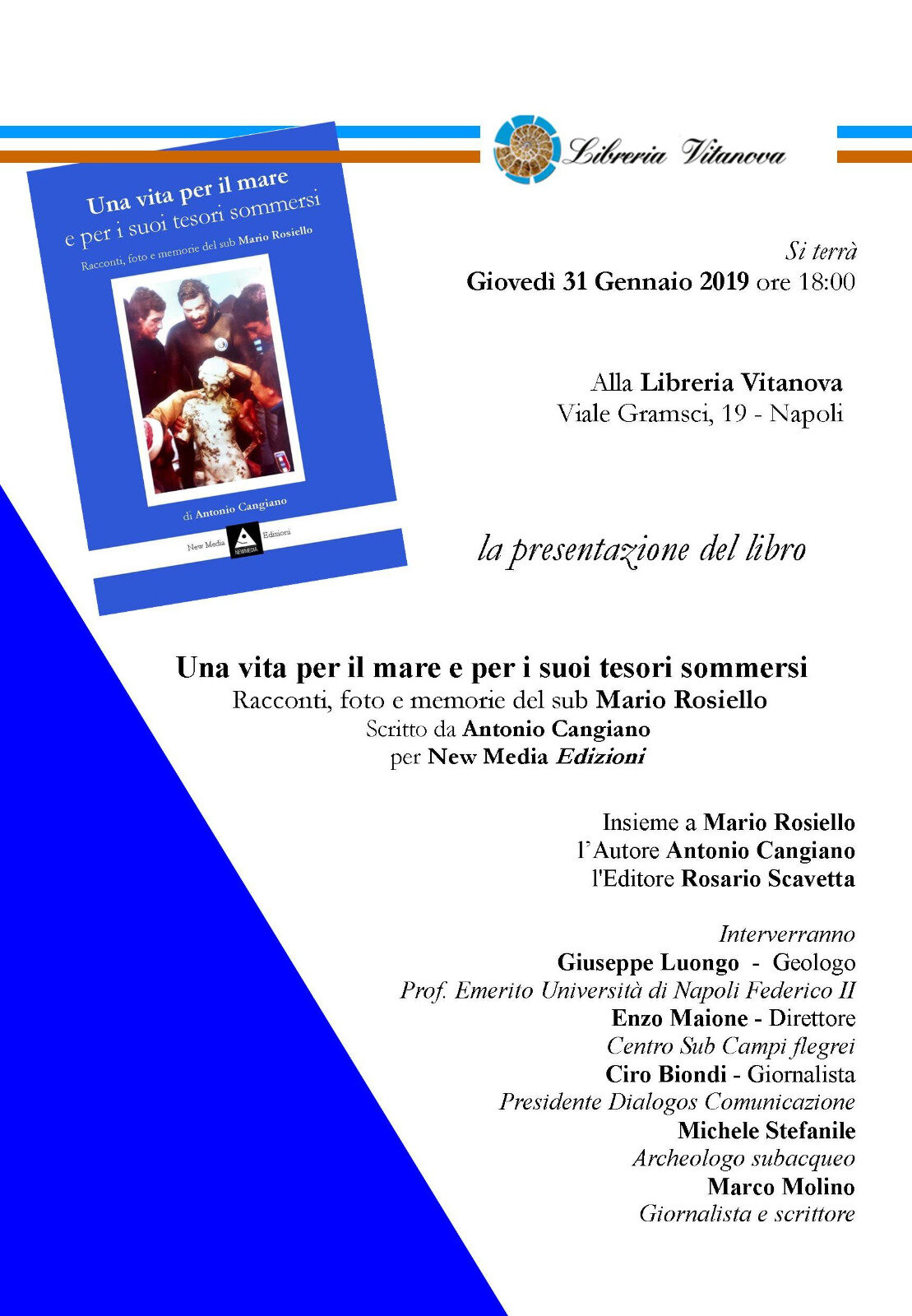 Sarà presentato giovedì 31 gennaio, alle ore 18.00, presso la libreria Vitanova (Viale Gramsci, 19 – Napoli), il libro, “Una vita per il mare e per i suoi tesori sommersi” – Racconti, foto e memorie del sub Mario Rosiello. Nel libro – intervista, edito da New Media Edizioni e curato dal giornalista e scrittore Antonio Cangiano, Mario Rossiello, posillipino “doc”, sommozzatore di professione presso Stazione Zoologica Anton Dhorn di Napoli ha sentito l’esigenza di raccontare le proprie esperienze di vita professionale, i personaggi illustri incontrati, gli aneddoti che hanno caratterizzato la sua “vita per il mare”. All’interno del volume le scoperte concluse da Rosiello, tra le tante, le sculture del ninfeo imperiale di Baia, il rinvenimento nel fiume Sele di un volto in bronzo del V sec. a.C. raffigurante Poseidone; l’individuazione di una statua di Nettuno nelle acque della Grotta Azzurra a Capri e un tesoro di oltre duemila monete d’epoca romana recuperate dal letto del fiume Garigliano. Alla presentazione, insieme a Mario Rosiello, saranno presenti l’autore, Antonio Cangiano e l’editore Rosario Scavetta. Interverranno all’incontro Giuseppe Luongo – Geologo (Prof. Emerito Università degli Studi di Napoli – Federico II); Enzo Maione (Centro Sub Campi Flegrei); Ciro Biondi (Giornalista – Presidente di Dialogos comunicazione); Michele Stefanile (Archeologo Subacqueo); Marco Molino (Giornalista e scrittore). Così definisce il libro, Antonio Cangiano, autore dell’opera: “Una raccolta di piacevoli conversazioni sul mare e sui suoi misteri, quelle contenute in questa breve biografia dedicata al sub Rosiello, che affascinerà non poco il lettore. Un caleidoscopio di avventure, esplorazioni, salvataggi in mare, e sensazionali scoperte che hanno scritto la storia recente dell’archeologia subacquea nei Campi Flegrei e non solo”.
