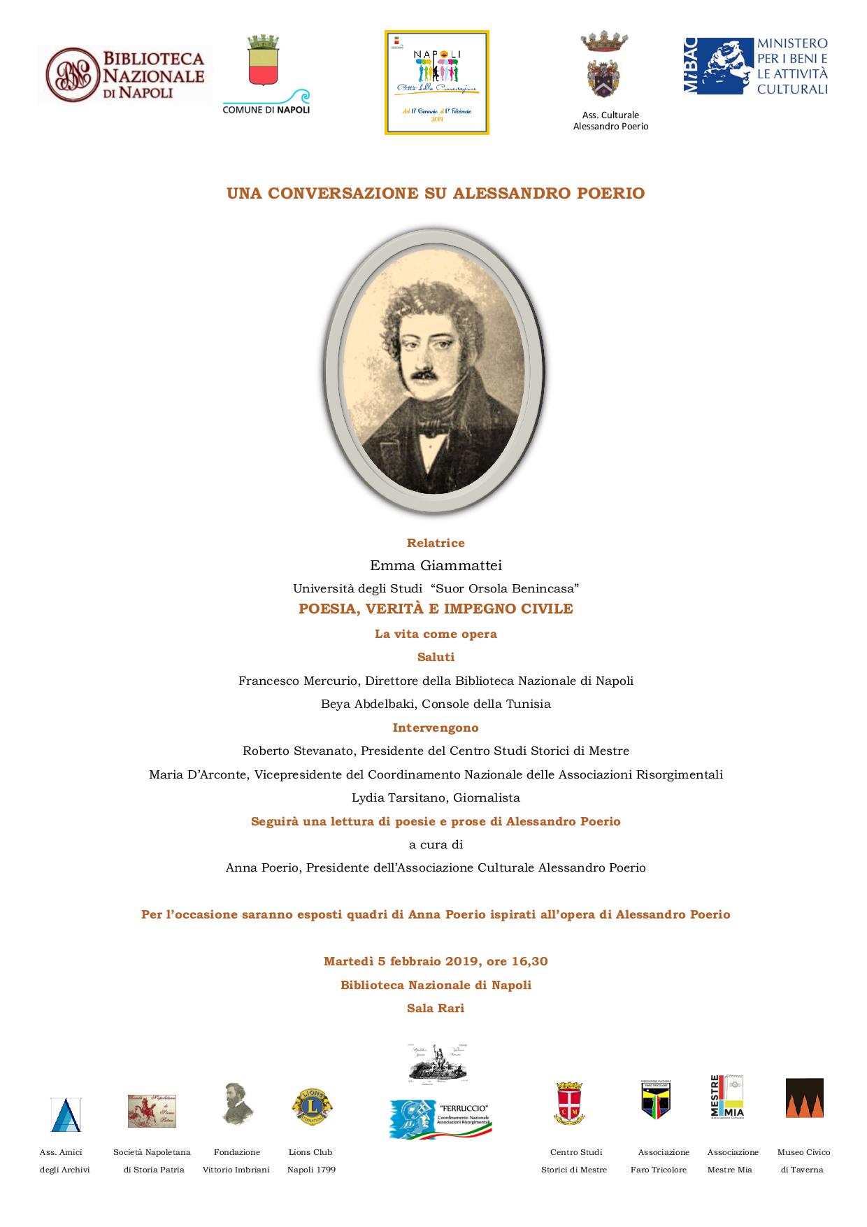 Martedì 5 febbraio 2019, ore 16.30, alla Biblioteca Nazionale di Napoli Emma Giammattei, Università degli Studi Suor Orsola Benincasa, parlerà di Alessandro Poerio sul tema “Poesia, Verità e Impegno Civile. La vita come opera”. Interverranno: Francesco Mercurio, Direttore della Biblioteca Nazionale; Beya Abdelbaki, Console della Tunisia; Roberto Stevanato, Presidente del Centro Studi Storici di Mestre; Maria D’Arconte, Presidente dell’Associazione Faro Tricolore di Desenzano del Garda, Vicepresidente del Coordinamento Nazionale delle Associazioni Risorgimentali e Vicepresidente dell’Istituto del Risorgimento – Comitato di Mantova, e Lydia Tarsitano, Giornalista.