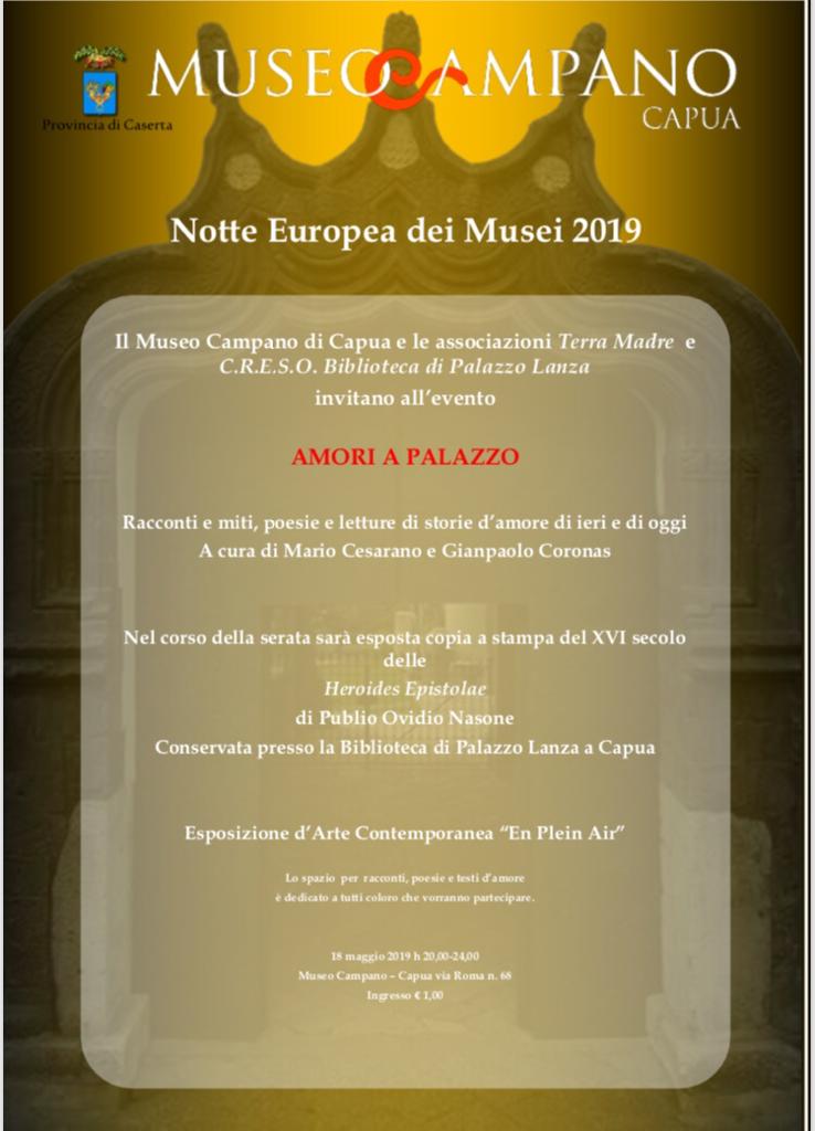 Nello splendido scenario della struttura museale di Capua si parlerà di “Amori a palazzo”: Racconti e miti, poesie e letture di storia d’amore di ieri e di oggi a cura di Mario Cesarano e Giampaolo Coronas .Nel corso della serata sarà esposta copia della stampa del XVI secolo delle Heroides Epistolae di Publio Ovidio Nasone conservata presso la biblioteca di Palazzo Lanza a Capua.