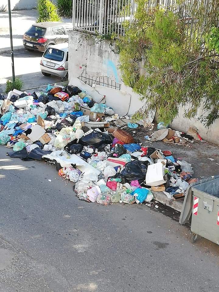 Scempio a Barra. Strade invase dalla spazzatura. Bidoni vuoti e cumuli di spazzatura sul marciapiede. Marciapiede completamente occupato dalla spazzatura che ha invaso anche parte della carreggiata.