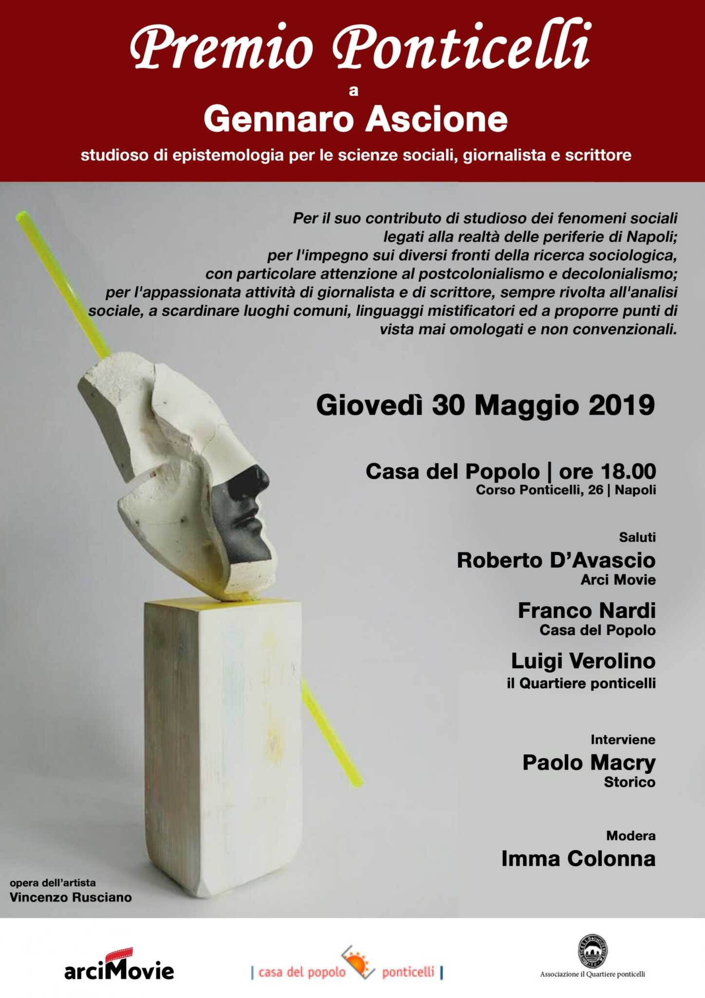 Giovedì 30 maggio 2019 alle ore 18.00 presso la Casa del popolo di Ponticelli, si svolgerà la terza edizione delPREMIO PONTICELLI, che sarà conferito a Gennaro Ascione, studioso di epistemologia per le scienze sociali, giornalista, scrittore, emblema di un riscatto culturale che, grazie a lui come a tanti altri giovani talenti, rende onore al nostro territorio.