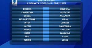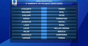 | 19° GIORNATA (A. 12/01 – R. 24/05) Cagliari-Milan Fiorentina-SPAL Verona-Genoa Inter-Atalanta Lazio-Napoli Parma-Lecce Roma-Juventus Sampdoria-Brescia Torino-Bologna Udinese-Sassuolo |