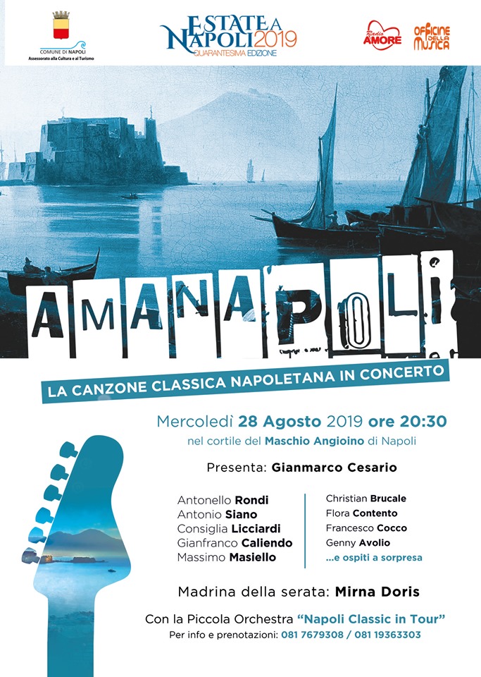 Mercoledi 28 Agosto, nell’ambito della Rassegna Estate a Napoli, Radio Amore e Officine della Musica presentano il progetto “Amanapoli”, la Canzone Classica napoletana in concerto. La manifestazione ha l’intenzione di valorizzare e di esaltare la nostra grande cultura musicale attraverso l’esecuzione di alcune delle canzoni più rappresentative del nostro inesauribile patrimonio storico. Accompagnati dalla Piccola Orchestra “Napoli classic in tour”, composta da Andrea Beneduce al mandolino, Christian Brucale alle percussioni, Martino Brucale ai fiati, Giuseppe Mazzillo al pianoforte e Stefano Romano al Contrabasso, ci saranno gli interpreti: (in ordine alfabetico) Antonello Rondi, Antonio Siano, Christian Brucale, Consiglia Licciardi, Flora Contento, Francesco Cocco, Franco Malapena, Genny Avolio, Gianfranco Caliendo e Massimo Masiello. Madrina della serata Mirna Doris.