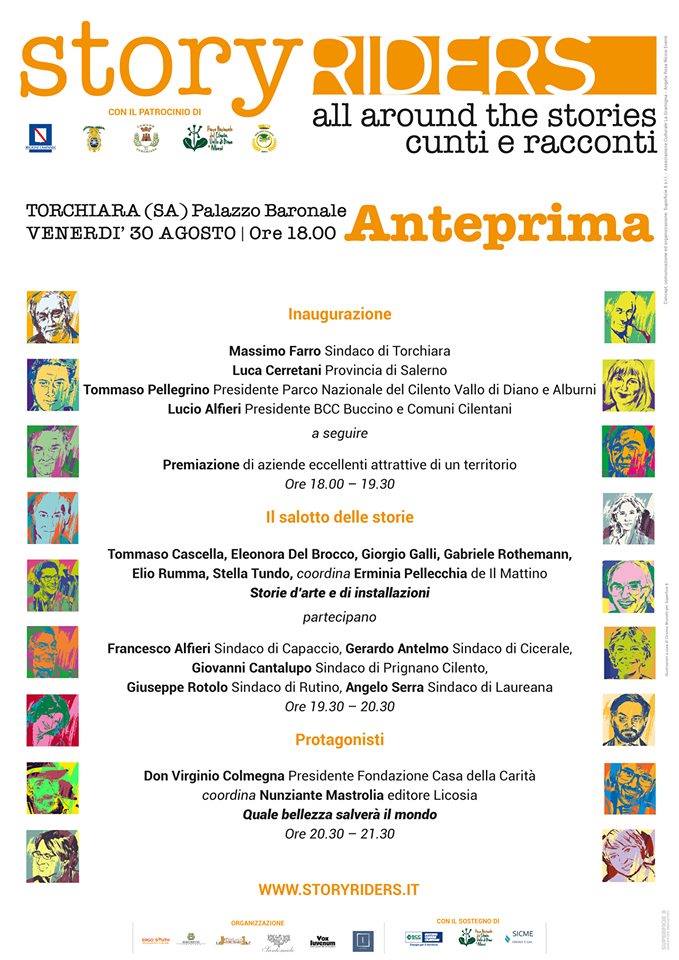 Giunta alla sua quinta edizione ritorna Story Riders, la manifestazione che trasforma Torchiara nel paese della storie, con ospiti d’eccezione. La manifestazione, ideata da Angela Riccio, gode del patrocinio del Comune di Torchiara, della Provincia di Salerno, della Regione Campania e del Parco Nazionale del Cilento.