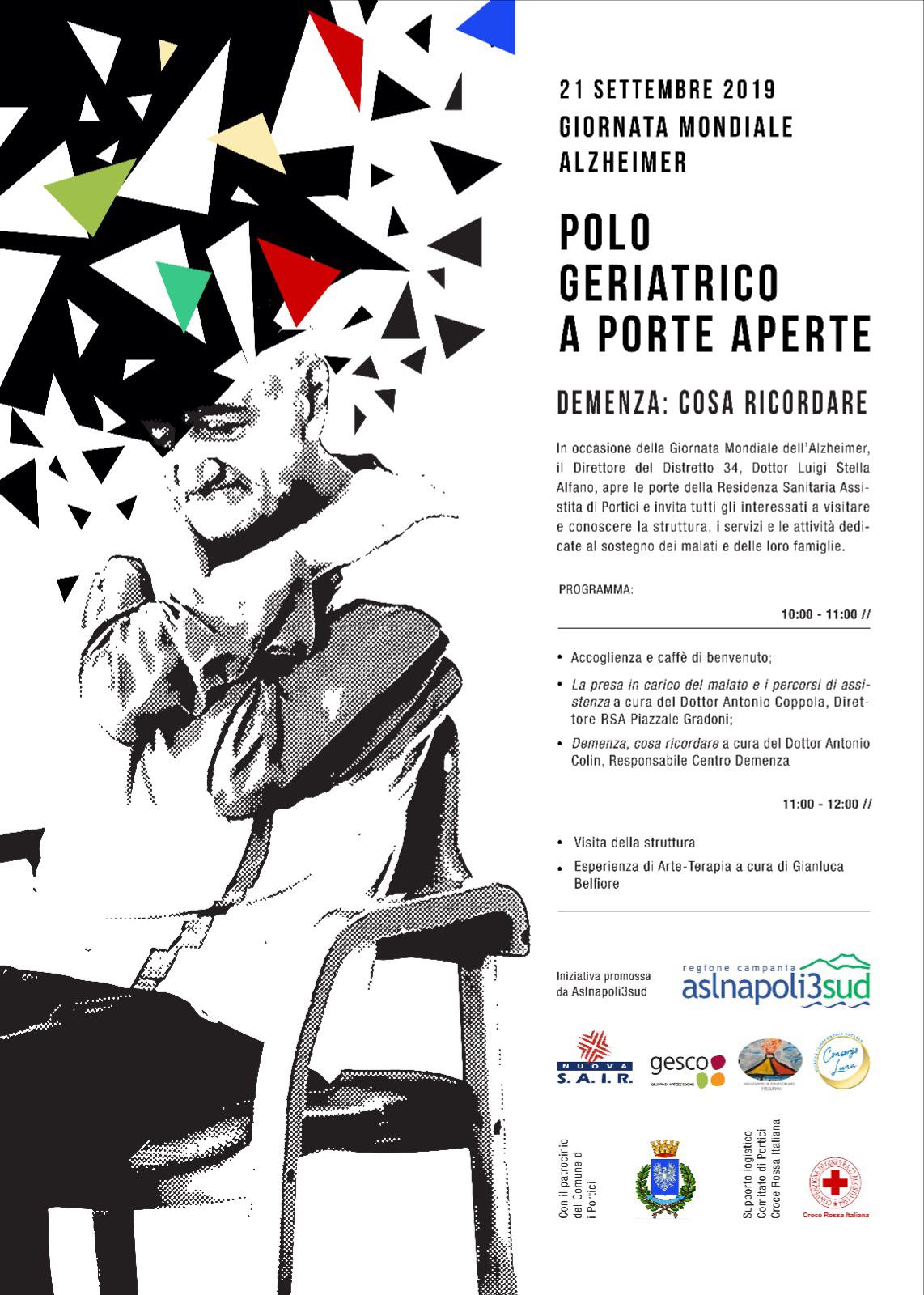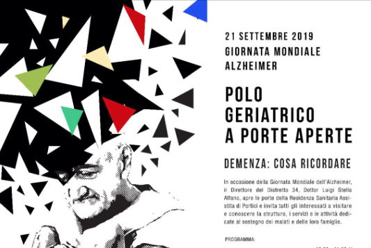 Il 21 settembre 2019: Giornata Mondiale dell’Alzheimer. Portici ore 10,00 “Porte aperte” al Polo Geriatrico del Distretto ASL in via Gradoni. Iniziativa promossa dalla ASL Napoli 3 Sud e il Patrocinio del Comune di Portici. Il Polo Geriatrico del distretto ASL di Portici offre in questa giornata un evento “PORTE APERTE” alle attività e agli spazi con visita della struttura Residenza Sanitaria Assistenziale. La memoria sarà il filo conduttore del percorso che inizia con una mostra fotografica del Dr. Gianluca Belfiore. Seguirà la visita alla palestra e a una sala operativa e sarà possibile vedere una stanza, dove alloggiano i nostri ospiti. Da qui il percorso proseguirà alla sala conferenza dove i visitatori saranno accolti dal Direttore RSA Dr. Antonio Coppola, che parlerà sulla “Presa in carico del malato e i percorsi dell’assistenza”.