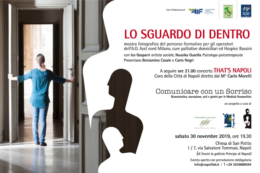 Lo sguardo di dentro è una mostra fotografica che in 22 scatti narra il vissuto emotivo degli operatori sanitari coinvolti nell’assistere i pazienti nella fase critica del fine vita. La mostra è organizzata dai componenti del percorso formativo per gli operatori dell’A.O. Asst Nord di Milano Cure Palliative domiciliari e Hospice Bassini, ideato da Ico Gasparri, artista sociale, e Nausika Gusella, psicologa-psicoterapeuta del team sanitario milanese. Gasparri e Gusella illustreranno le dinamiche del progetto finanziato dall’Associazione Una mano alla vita Onlus .
