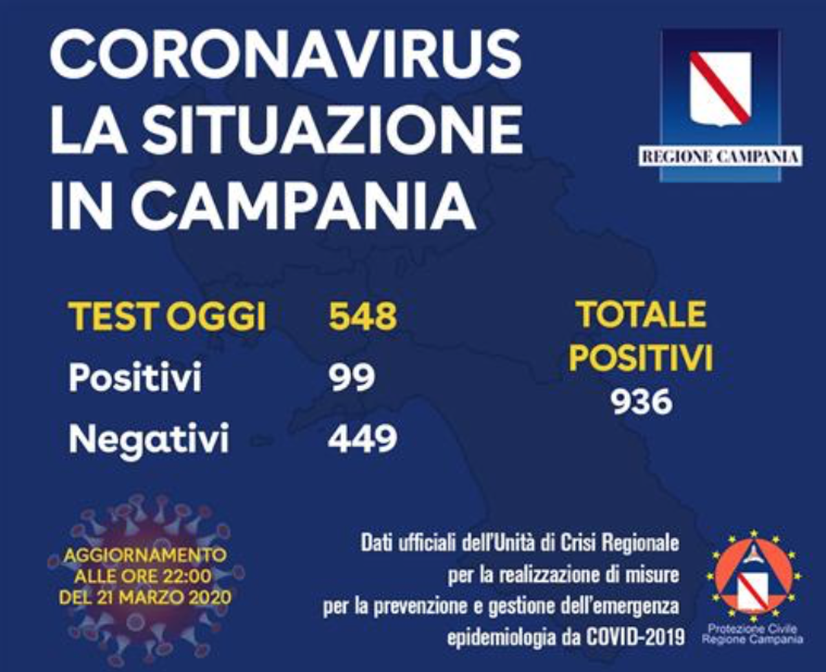 E’ salito a 936 il totale delle persone contagiate dal nuovo coronavirus in Campania. Il dato è aggiornato alle 22 di oggi 21 marzo. Sono infatti 92 i casi, cui vanno sommati i sette casi riscontrati ieri all’ospedale Sant’Anna ma arrivati in nottata e conteggiati solo oggi per un totale di 99, le persone risultate positive al Coronavirus in Campania nelle ultime ventiquattro ore. Un dato sostanzialmente in linea con quello degli ultimi giorni che porta il totale dei positivi in Campania a quota 936. le vittime invece sono 33.