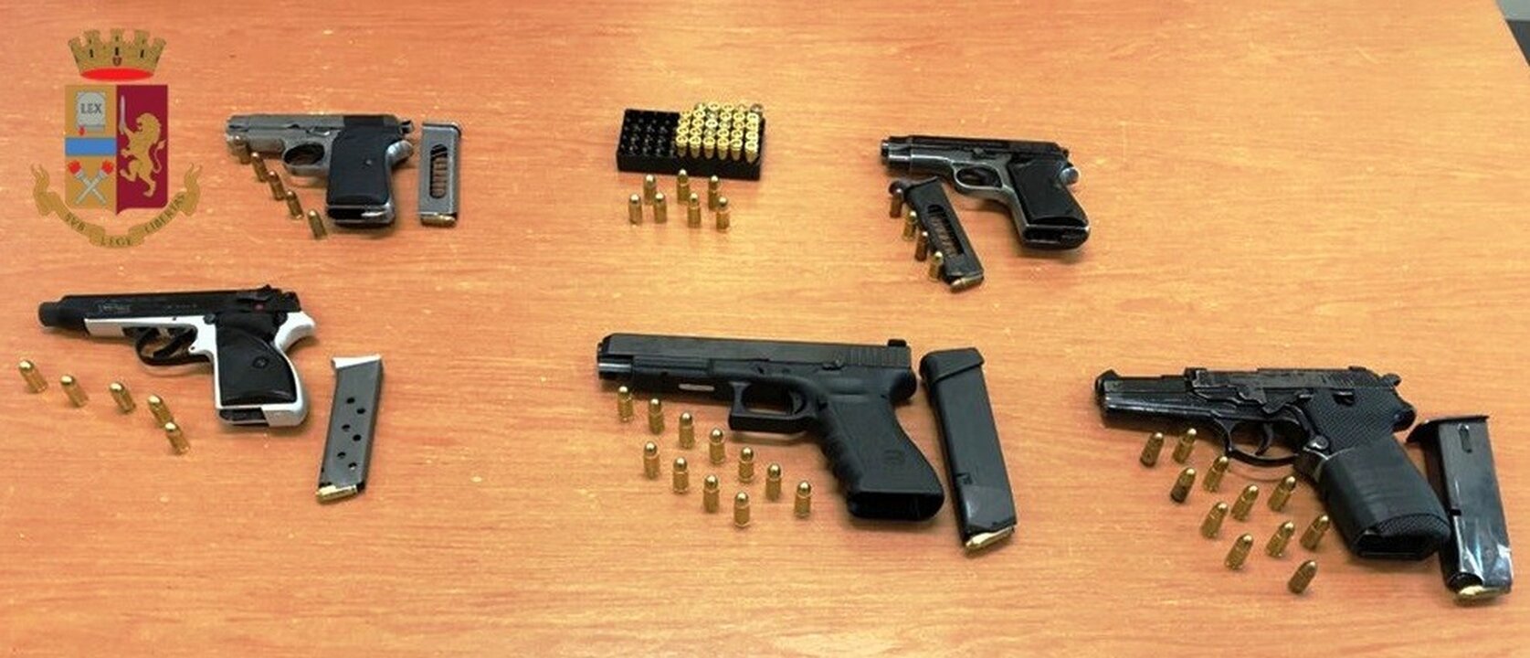 I poliziotti li hanno bloccati rinvenendo cinque pistole, di cui due con matricola cancellata, e 76 cartucce di diverso calibro; inoltre, è stata accertata la presenza di un sistema di videosorveglianza a circuito chiuso che inquadrava il perimetro esterno dell’edificio.