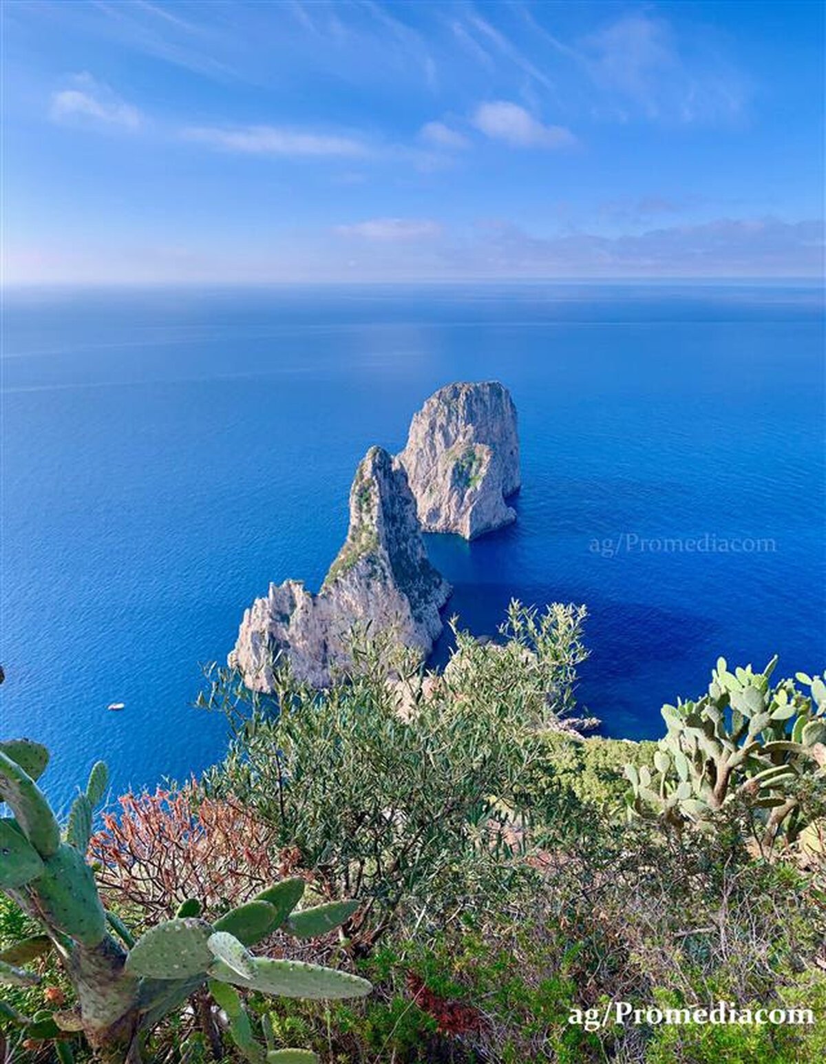 Capri. L’alba del nuovo giorno ripresa da Tuoro, la collina che sovrasta i famosi Faraglioni, il ritmo lento della natura, le prime luci del giorno dove i protagonisti sono da sempre una famiglia di Falchi Pellegrini e qualche sparuto Gabbiano e le lucertole che si rilassano sui muretti in pietra profumati di rosmarino e di Ginestra che a Capri é soprannominata “Il fiore di San Costanzo” in onore del patrono dell’isola. La luce del mattino che colora i fichi d’india in fiore, che tinge di verde i pini che ornano il panorama