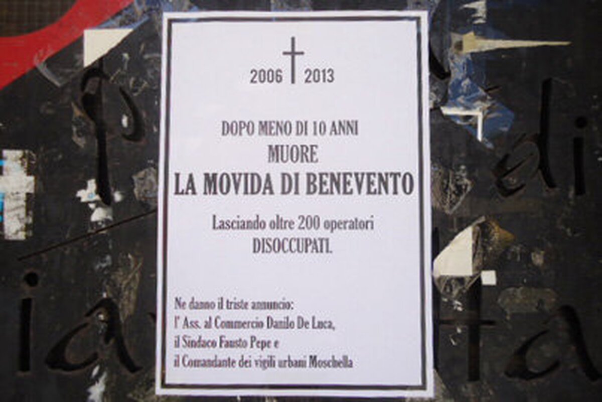 Manifesti funebri che annunciano la crisi del settore e la mancanza di chiarezza sono comparsi sulle serrande dei locali della movida di Benevento che hanno deciso di restare chiusi. Il manifesto cita le ordinanze del 17 e 18 maggio e quella del 20 maggio che impone la chiusura delle attivita’ alle ore 23.