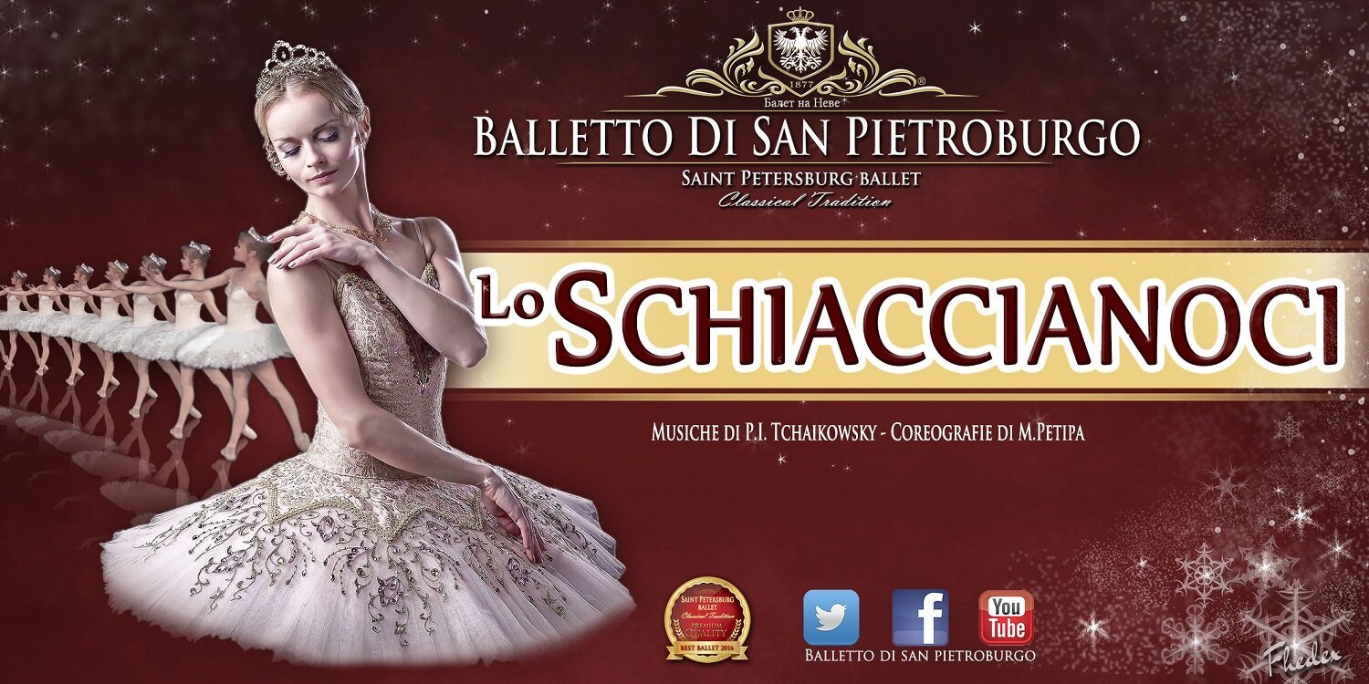 Amore, sogno e fantasia per uno dei balletti più affascinanti della storia della danza classica. Le scenografie incantate del Balletto di San Pietroburgo rendono partecipe lo spettatore della stessa fiaba di Hoffmann. Per le sue caratteristiche di favola a lieto fine e per la vicenda pervasa da un’atmosfera fatata di festa, “LoSchiaccianoci”: una fiaba fatta di dolciumi, soldatini, albero di natale, fiocchi di neve e fiori che danzano, topi cattivi, prodigi, principe azzurro e fatina, è diventato un balletto che ammalia i bambini e incanta i grandi. Per questo è lo spettacolo più rappresentato nel mondo durante le festività natalizie. La conclusione è segnata dallo squisito Valzer dei Fiori, dopo il quale Clara si ritroverà nella sua poltrona con il suo schiaccianoci in grembo, felice di questo sogno di Natale.