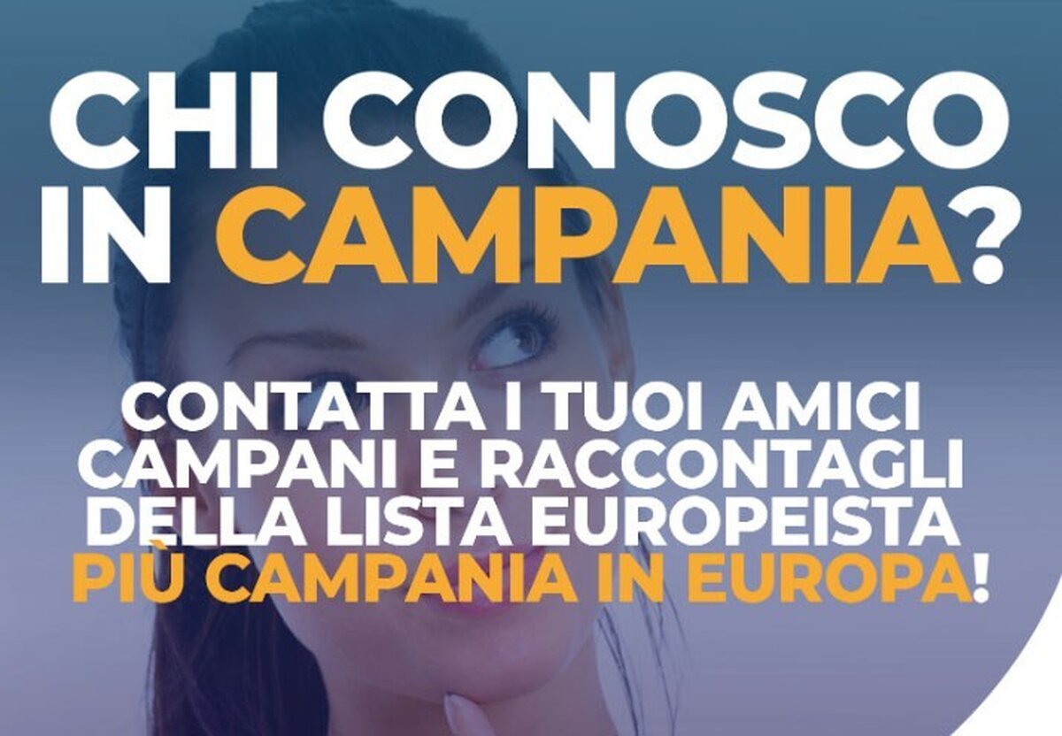 Più Campania in Europa lancia quindi un’importante iniziativa, un appello, rivolto a tutti gli italiani innamorati dell’Europa unita che hanno amici e parenti in Campania, affinchè li invitino a far conoscere la nostra lista. Chi di noi non ha una persona da contattare in Campania per far conoscere e votare i nostri candidati al consiglio regionale? La lista Più Campania in Europa, sarà in appoggio al presidente uscente Vincenzo De Luca. Abbiamo scelto cinque donne capolista nelle cinque province della regione, ma abbiamo soprattutto scelto professionisti che vogliono contribuire a migliorare la Campania. Per questo abbiamo bisogno anche del tuo aiuto e ti chiediamo di contattare tutte le persone che puoi, amici e parenti: perché è insieme e uniti che si vincono le sfide più importanti!