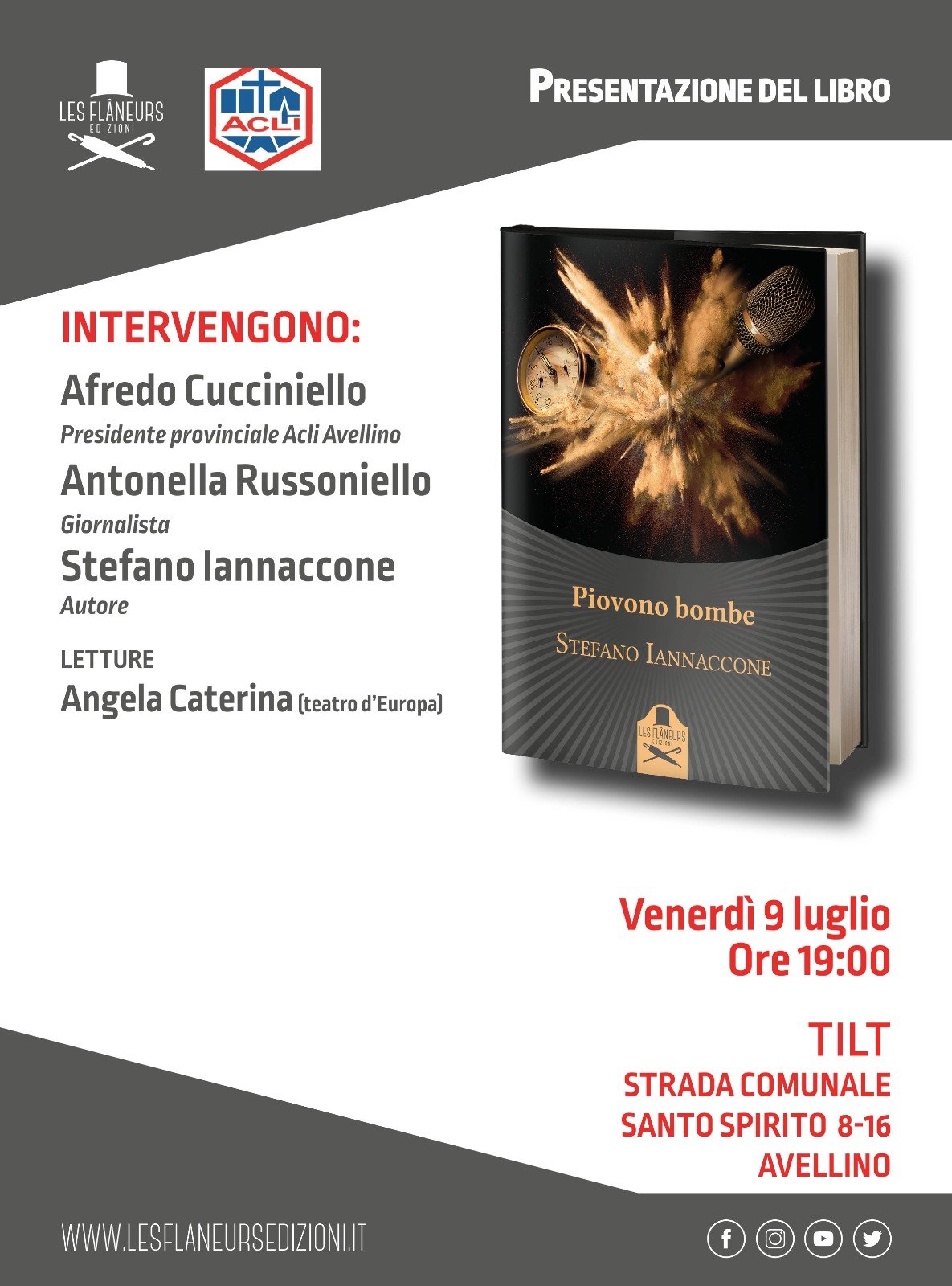 Venerdì 9 luglio, alle ore 19, al Tilt! Tattoo Bar Events in via Santo Spirito ad Avellino, si terrà la presentazione del romanzo “Piovono bombe” di Stefano Iannaccone, edito da Les Flaneurs.
