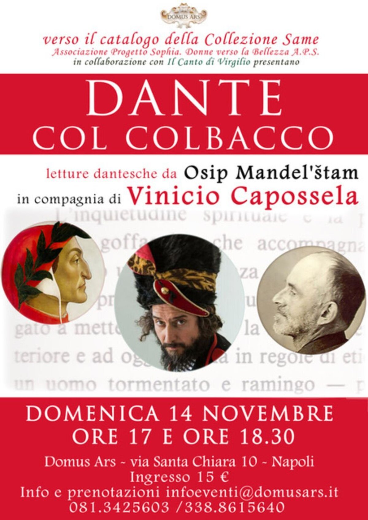Un Dante piccolo, goffo, un po’ perduto e un po’ sparuto, che assomiglia a tutti noi molto più dell’arcigno e maestoso Vate che spesso ci terrorizza: questo è il poeta che ci accompagnerà domenica 14 novembre, alle ore 18.30, in un pomeriggio di letture, visioni e riflessioni nella bella cornice della Domus Ars di Napoli.