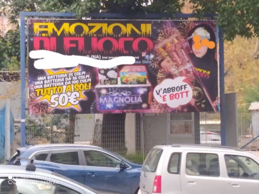 È questa la pubblicità, in stile Gomorra, di una rivendita di fuochi d’artificio napoletana riportata su un manifesto 6×3 affisso in strada. La scoperta è stata fatta dal consigliere comunale di Afragola Antonio Iazzetta che ha denunciato il contenuto della discutibile campagna pubblicitaria pro-botti sul proprio profilo Facebook.