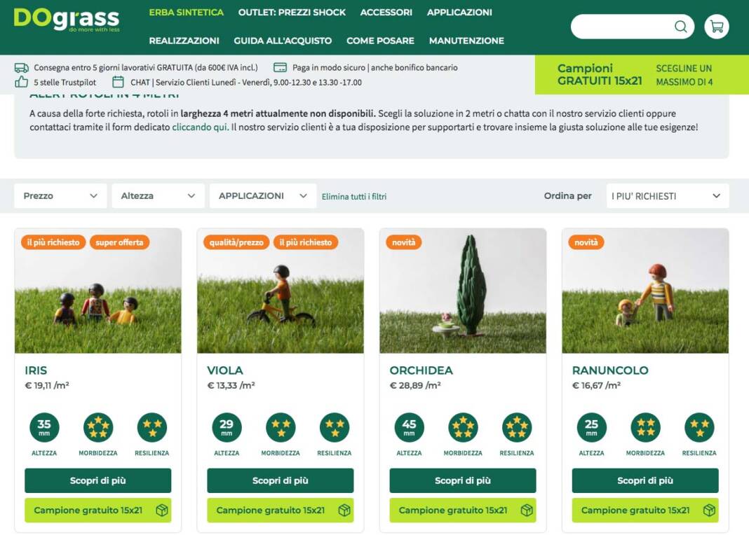 In questo contesto spicca senza dubbio DOgrass, portale e-commerce specializzato con un’esperienza sul mercato di oltre 30 anni, che mette a disposizione erba sintetica e accessori per prendersi cura al meglio del proprio prato artificiale, con la possibilità di risparmiare sulla spesa finale.