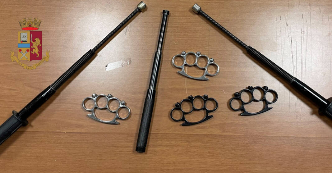 Gli operatori, con il supporto di una volante dell’Ufficio Prevenzione Generale, si sono recati presso il luogo dell’aggressione e, grazie alle descrizioni delle vittime, hanno riconosciuto e bloccato un gruppo di 7 giovani trovandoli in possesso di 4 tirapugni e 3 manganelli telescopici.