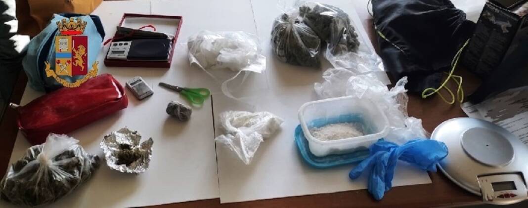 Gli operatori hanno recuperato la borsa in cui hanno rinvenuto 4 buste e un contenitore di plastica contenenti 458 grammi circa di cocaina, 3 buste con 236 grammi circa di marijuana, un involucro contenente 30 grammi circa di hashish e due bilancini di precisione; inoltre, in casa, hanno trovato un altro bilancino, materiale per il confezionamento della droga e 2855 euro.
