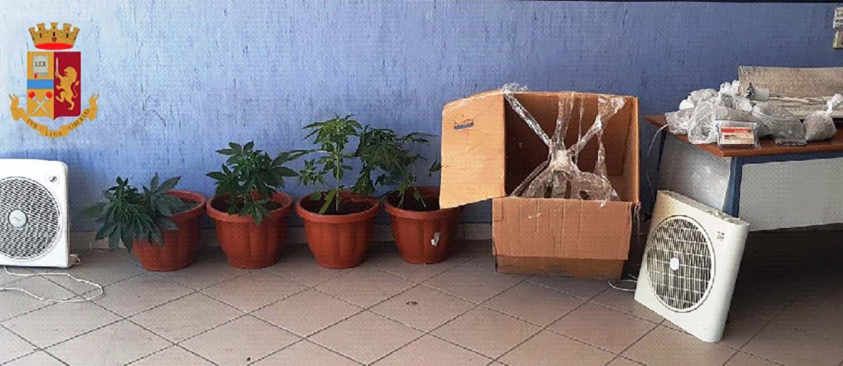 Li hanno scoperto una piccola serra per la coltivazione di piante di marijuana ed hanno sequestrato 5 piante, una lampada alogena per accelerarne la crescita con pannello riflettente, due ventilatori e una presa con temporizzatore mentre, in un’intercapedine, hanno rinvenuto 6 buste contenenti circa 722 grammi di marijuana, una scatola con 50 cartucce cal. 6.35 e un cellulare.
