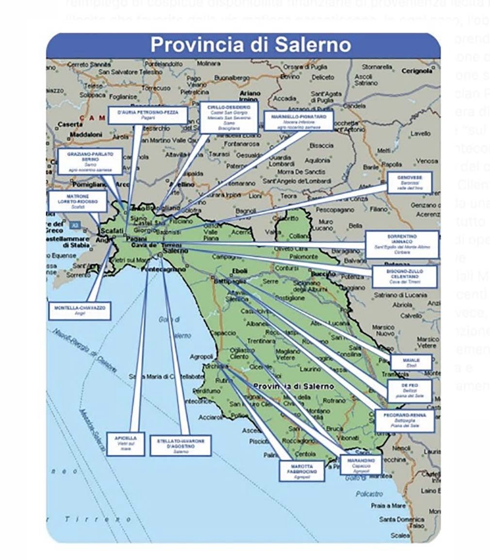“La provincia di Salerno – si legge nella relazione – presenta uno scenario criminale particolarmente disomogeneo con aspetti che mutano in ragione delle peculiarità geomorfologiche, economiche e sociali tipiche dei contesti territoriali estremamente diversificati sui quali insistono i vari sodalizi. Dalla zona urbana del capoluogo, all’Agro Nocerino-Sarnese e alla Valle dell’Irno, dalla Costiera Amalfitana alla Piana del Sele, al Cilento e al Vallo di Diano si assiste all’esistenza di strutture che sono adattate alla situazione in cui esercitano la loro operatività.