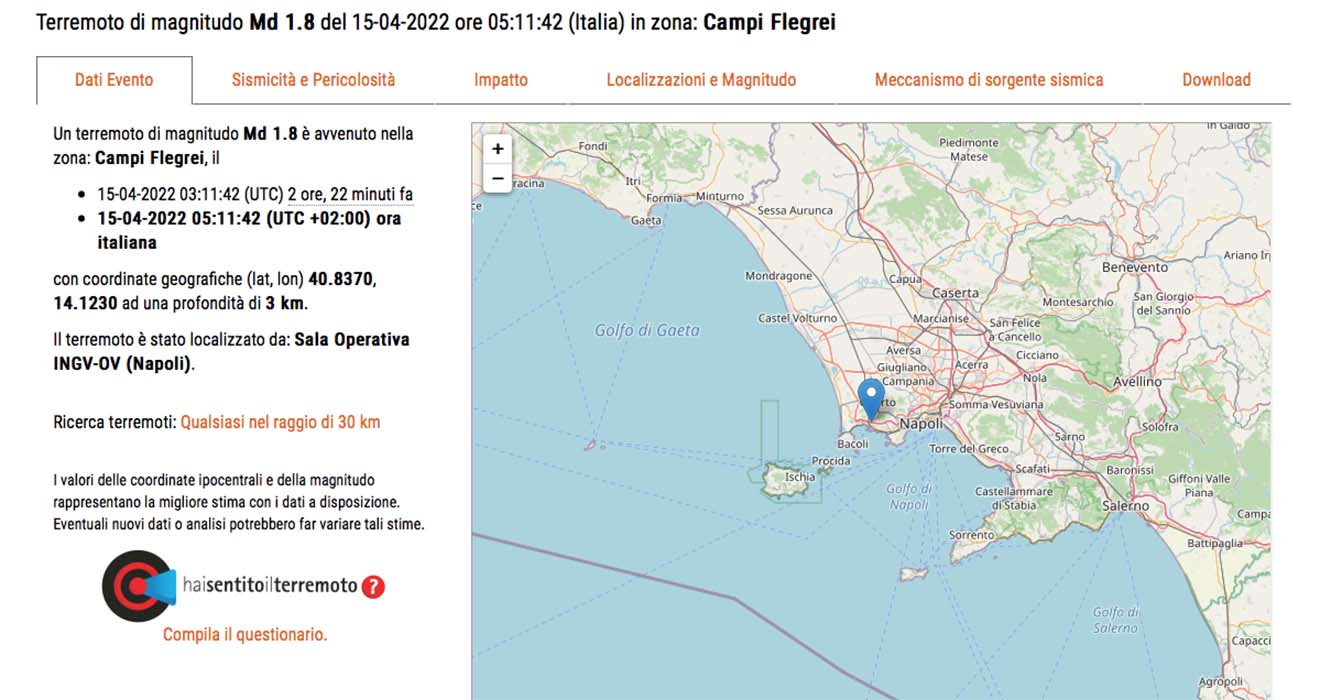 Un terremoto di magnitudo magnitudo 1.8 è avvenuto all’alba nella zona ai Campi Flegrei.