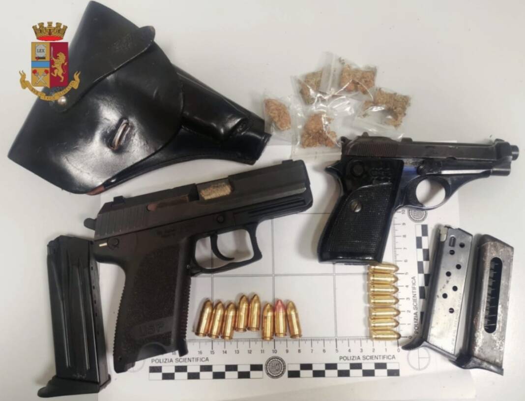 Ieri sera gli agenti del Commissariato di Afragola e del Reparto Prevenzione Crimine Campania hanno effettuato un controllo presso l’abitazione di un uomo in via Salvator Rosa a Cardito dove hanno rinvenuto, dietro la cassettiera della camera da letto, una pistola “Usp Compact” cal. 9×19 con 8 cartucce, una pistola “Beretta” con 7 cartucce, entrambe con matricola abrasa, e 5 bustine contenenti 4,5 grammi circa di marijuana.