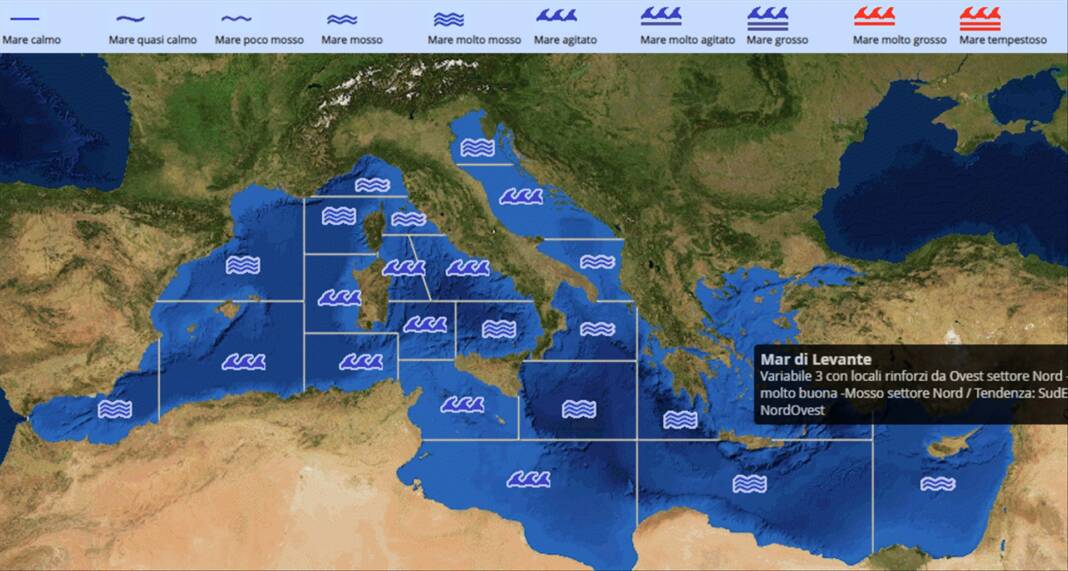 Sul Levante mari generalmente quasi calmi o poco mossi; venti deboli dai quadranti sud-orientali, in rotazione a sud.