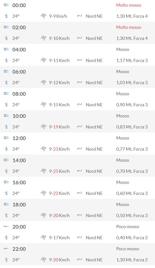 Giornata caratterizzata da Mare da mosso a molto mosso . Al pomeriggio mare mosso, nella notte mare molto mosso. Venti da moderati a forti provenienti dai quadranti nord orientali nell’arco di tutta la giornata con un’intensità minima di 11.3 km/h ed un’intensità massima di 25.2 km/h.