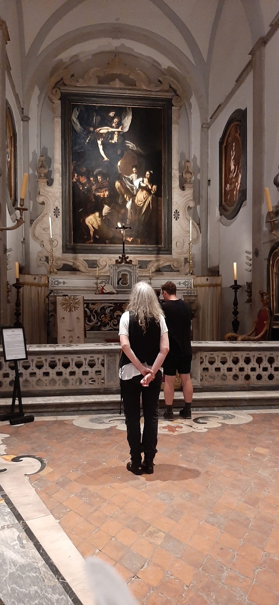 Oltre la Cappella, ha ammirato al primo piano le opere della Quadreria dove, dalla Sala del Coretto, si è fermata nuovamente ad ammirare il capolavoro del Caravaggio dall’alto. Un tour speciale accompagnata da Mario Quarantiello responsabile dell’Archivio storico del Pio Monte, da Maurizio Burale e Silvia Evangelista rispettivamente responsabile eventi e responsabile didattica dell’Istituzione.