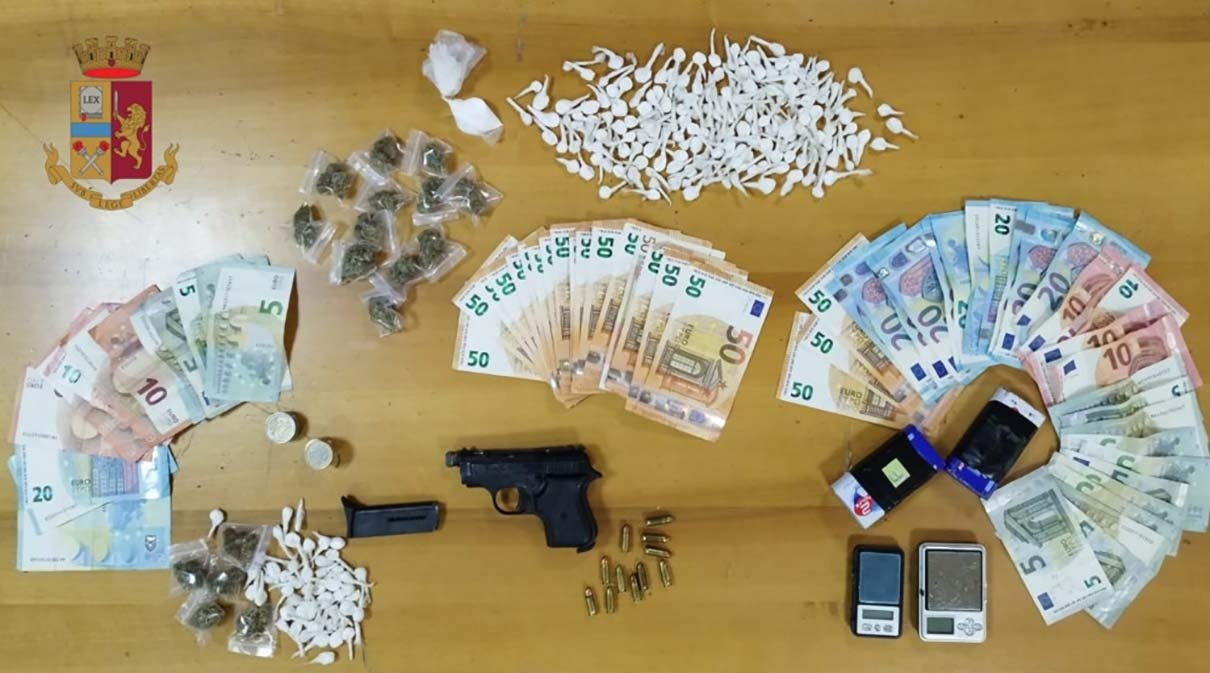 Casoria. Ieri pomeriggio gli agenti del Commissariato Vasto-Arenaccia, durante un servizio di contrasto allo spaccio di sostanze stupefacenti, hanno controllato l’abitazione di un uomo in via Quattro Giornate a Casoria dove hanno rinvenuto, in una cassetta di sicurezza portatile custodita in camera da letto, una pistola Bruni cal. 8 con matricola abrasa, 11 cartucce cal. 6,35, 185 dosi contenenti complessivamente circa 56,44 grammi di cocaina, 12 involucri con circa 13 grammi di marijuana, 2 bilancini di precisione, 2 telefoni cellulari, diversi foglietti manoscritti e 1395 euro, mentre all’interno della cassetta della posta è stato trovato un borsello con altre 48 dosi con circa 12 grammi di cocaina, 5 bustine con circa 6 grammi di marijuana e 156 euro.